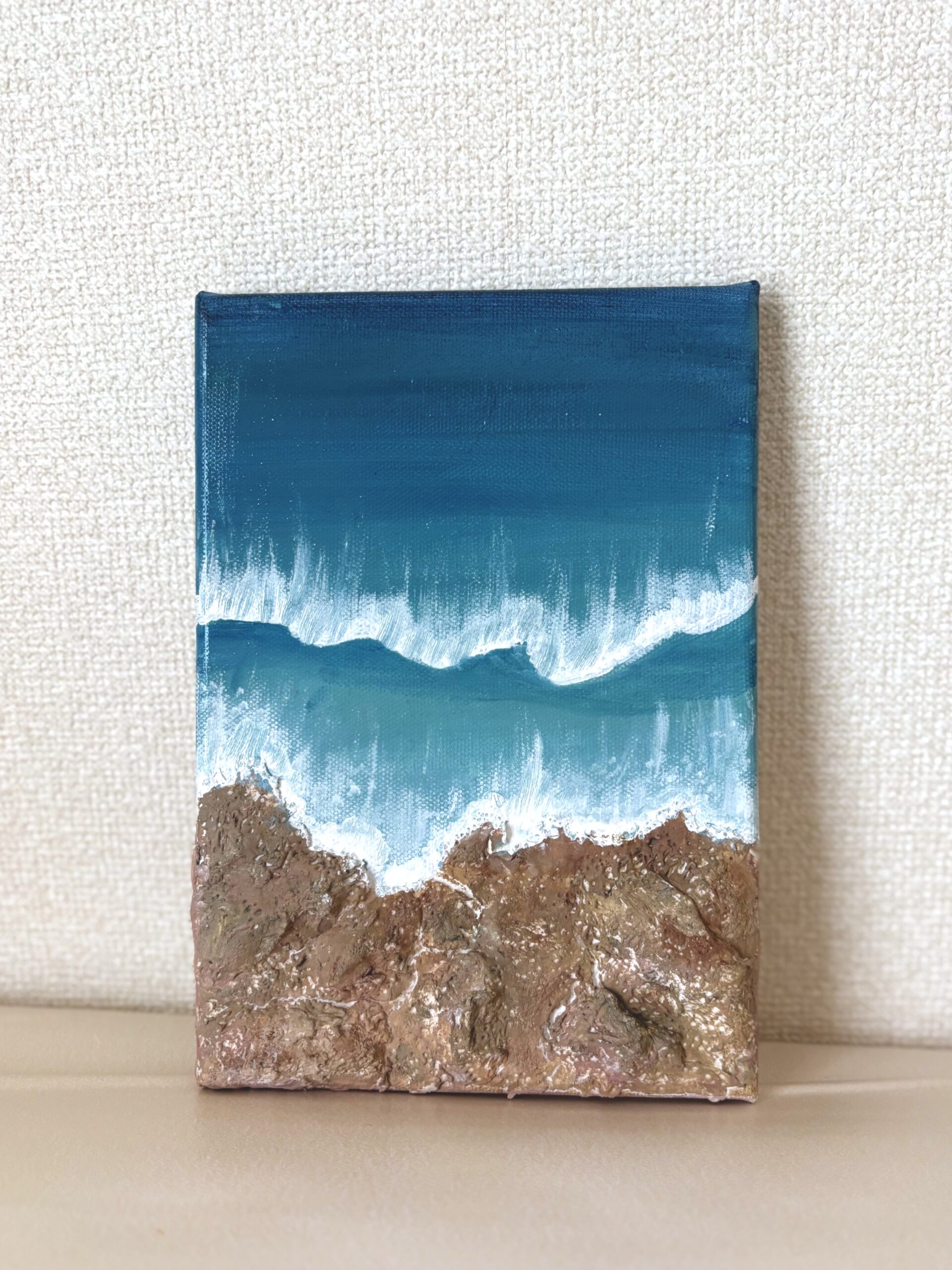 透明感のある海と、粘土で立体的に表現した岩に打ち寄せる波を描いた一枚です。