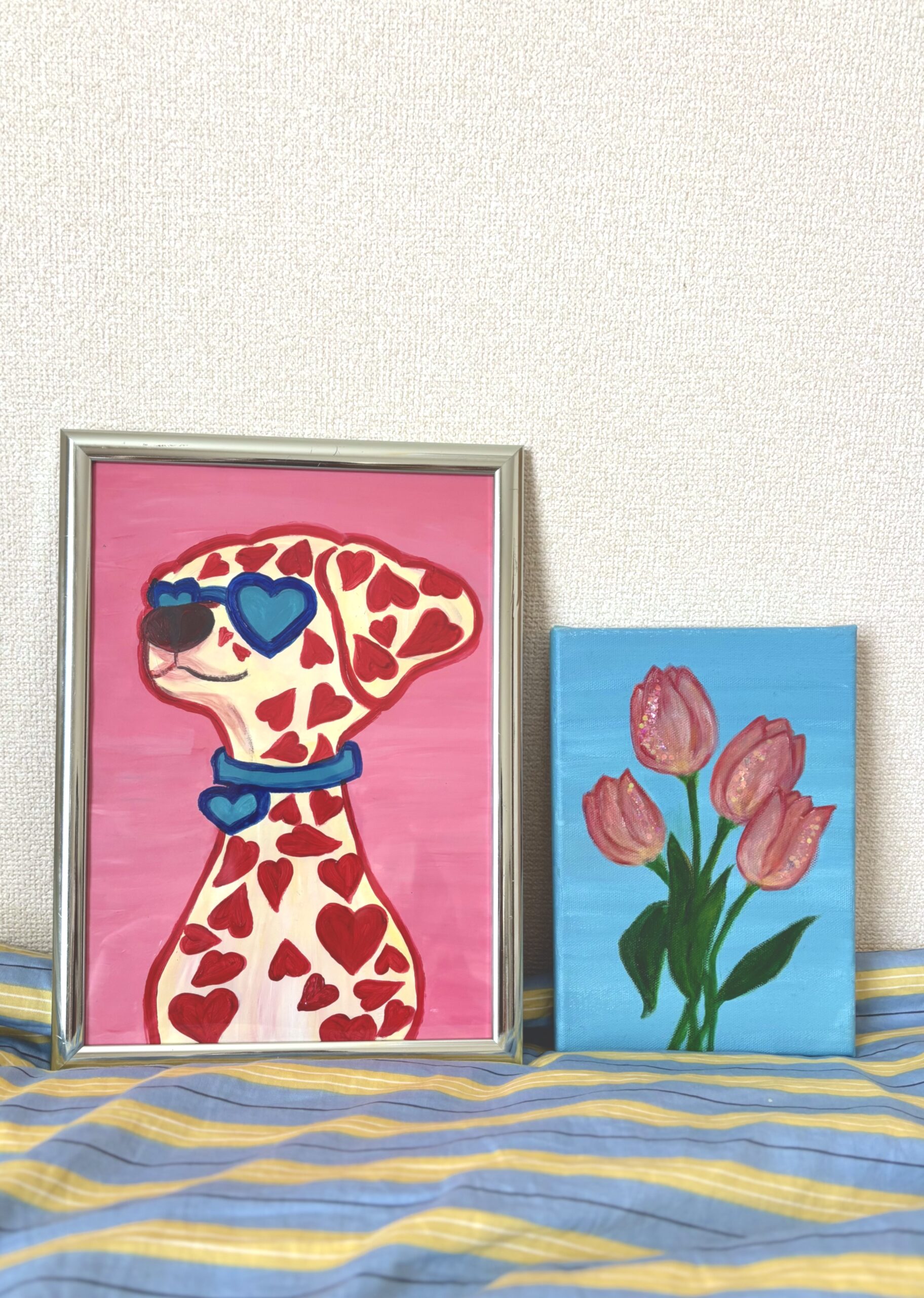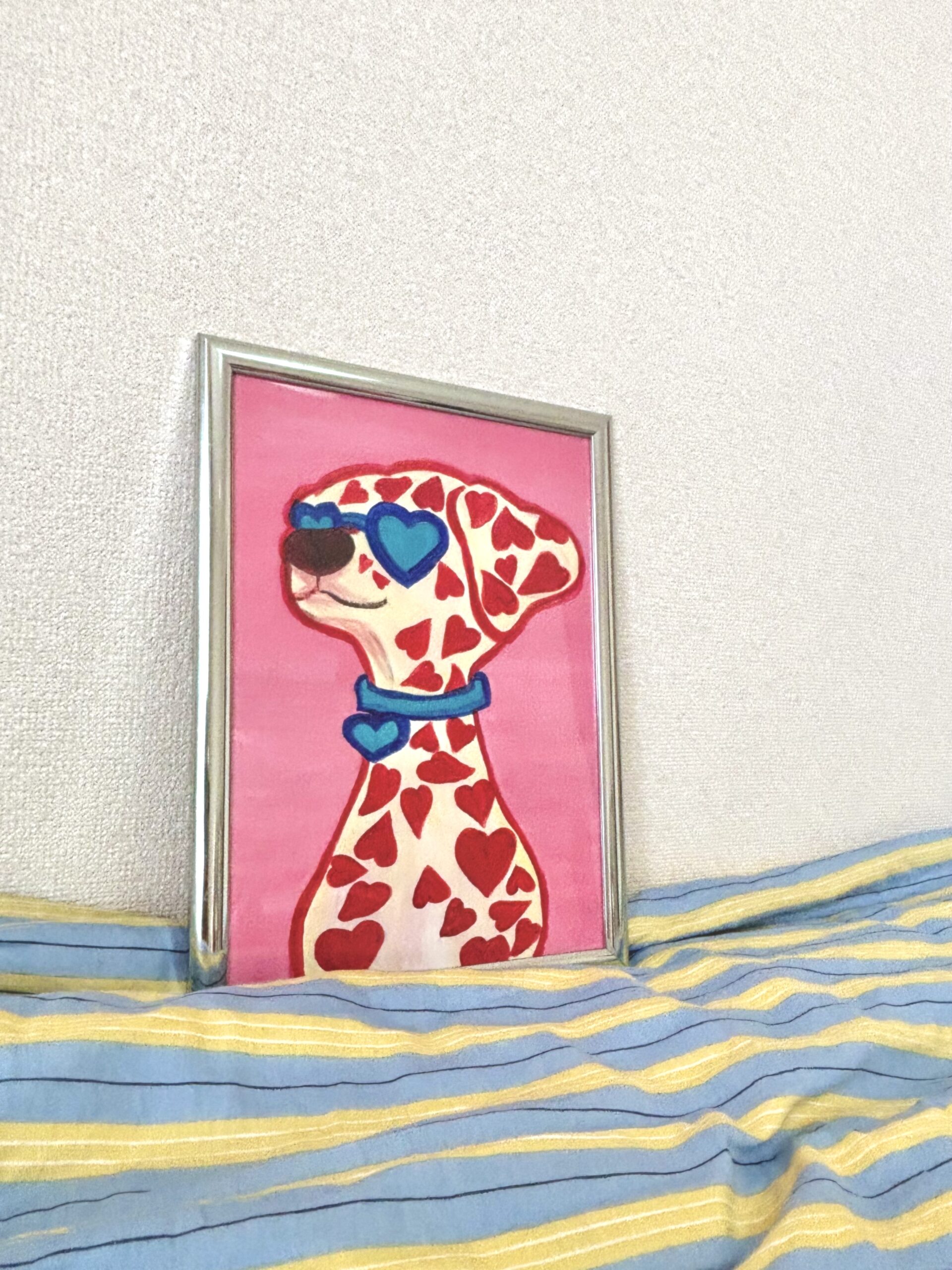 ハート模様に染まったダルメシアン。遊び心あふれるポップアート作品です。