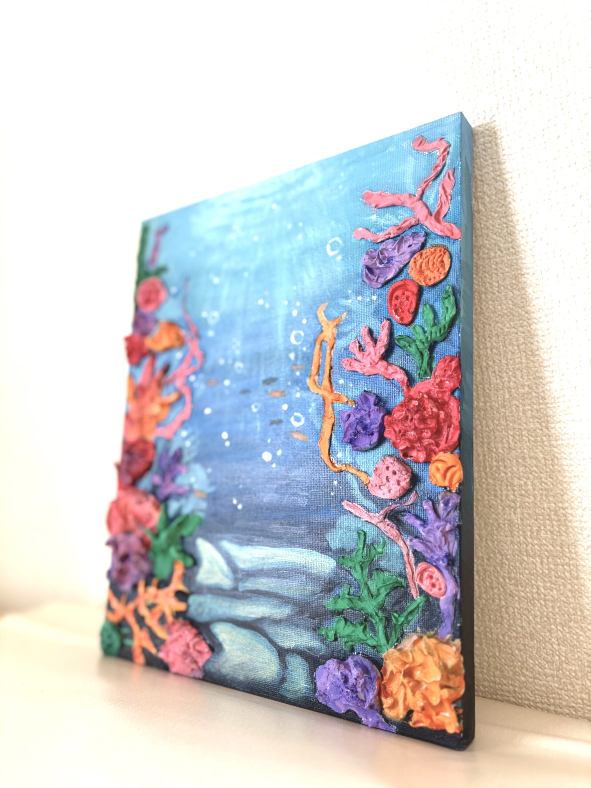 深い海のグラデーションに、粘土で立体的に表現したカラフルなサンゴたちを組み合わせました。